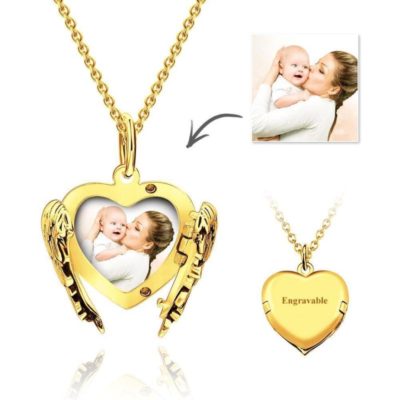Collar Personalizado Con Foto Grabable Corazón Alas De Ángel Plata Chapada En Oro Regalo Con Tema Del Día De La Madre