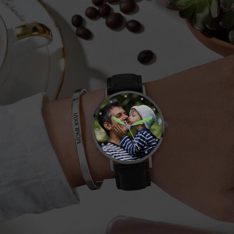 Reloj Con Foto Grabada Con Puntero Luminoso Correa De Cuero Negro 40Mm - Unisex