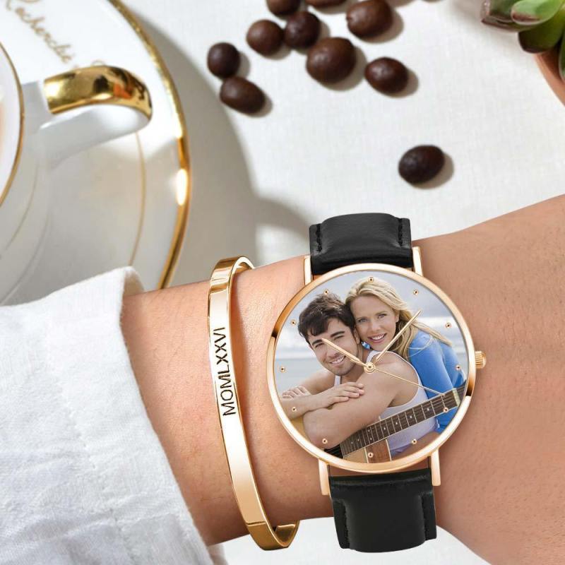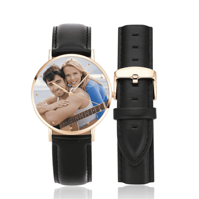 Reloj Unisex Grabado Con Foto En Tono Dorado Rosa Correa De Cuero Negro 40 Mm