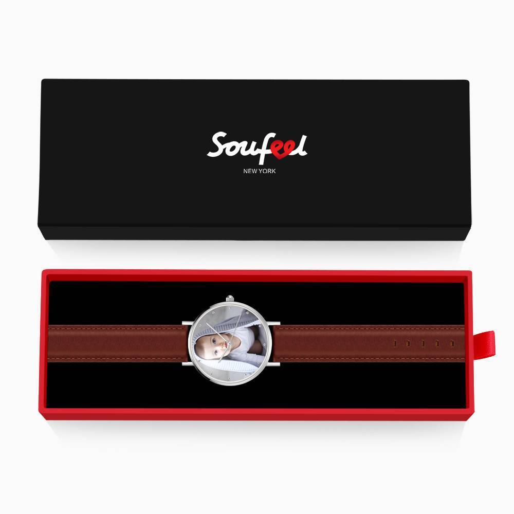 Reloj Grabable Unisex Con Foto Correa De Cuero Marrón 40Mm