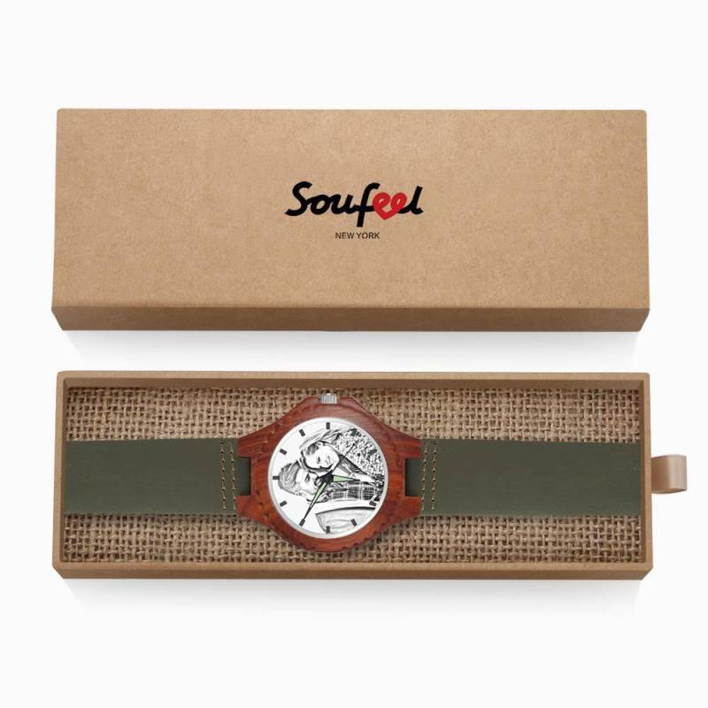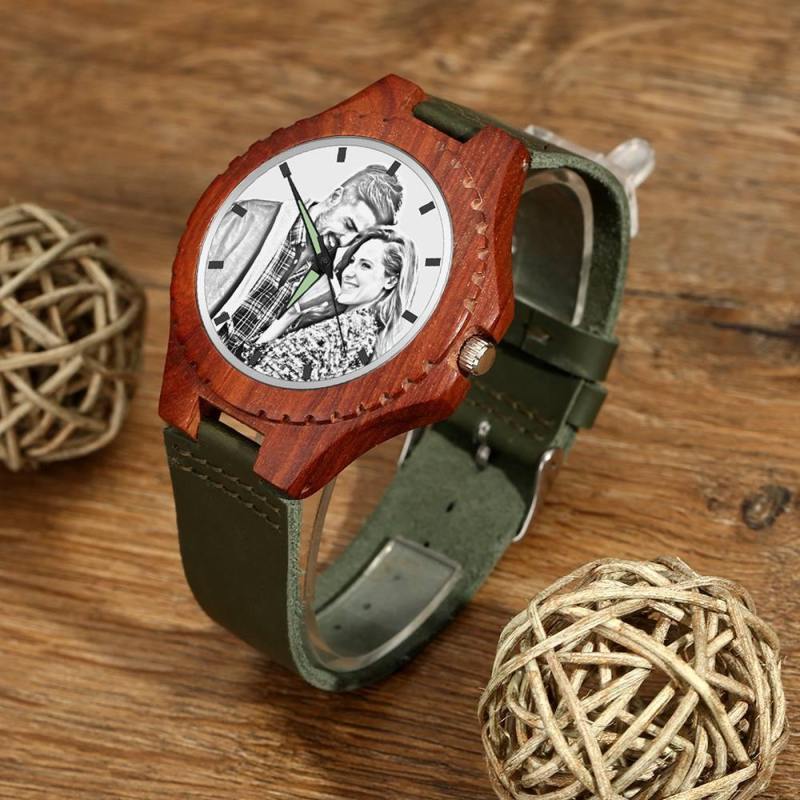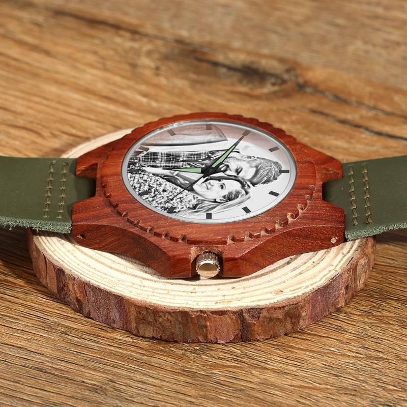 Reloj Unisex Con Foto Grabada De 48 Mm, Grano De Madera Y Correa Verde Oscuro - Sketch